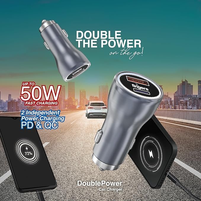 FINGERS DoublePower 50W Car Charger with Dual Ports (USB-C PD 40W + USB-A QC 40W), AI Intelligent Chipset, Fast Charging for Smartphones, Tablets, Smartwatches, and More