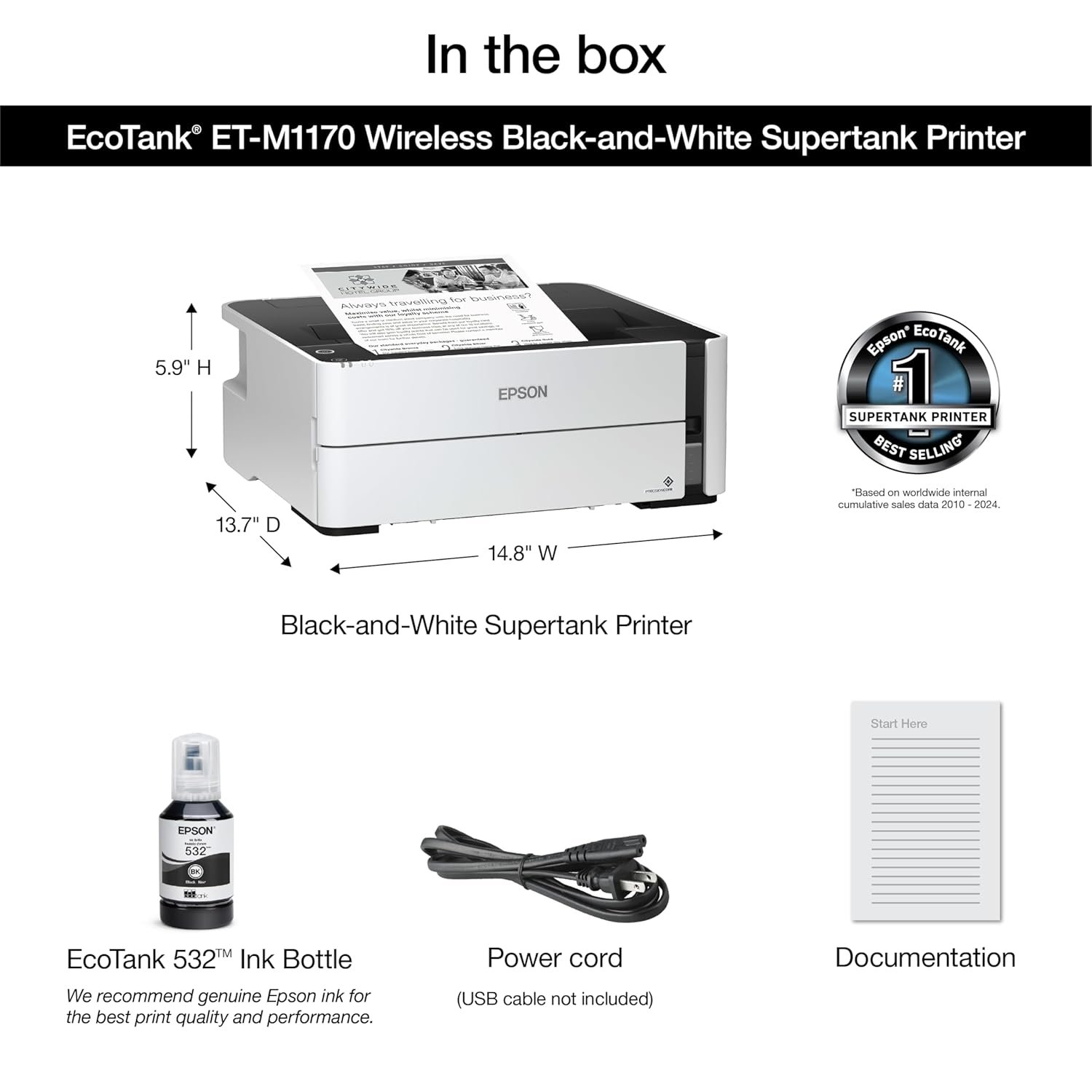 Epson Ecotank Wireless Monochrome Supertank Printer (M1170), White