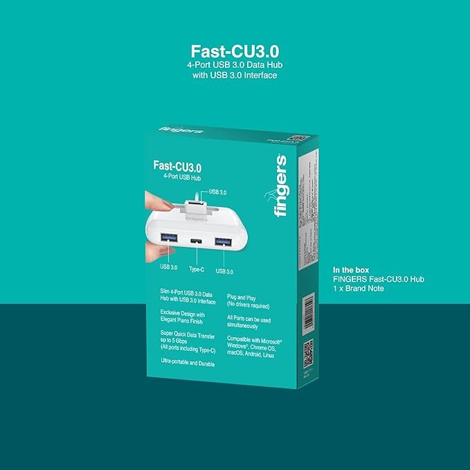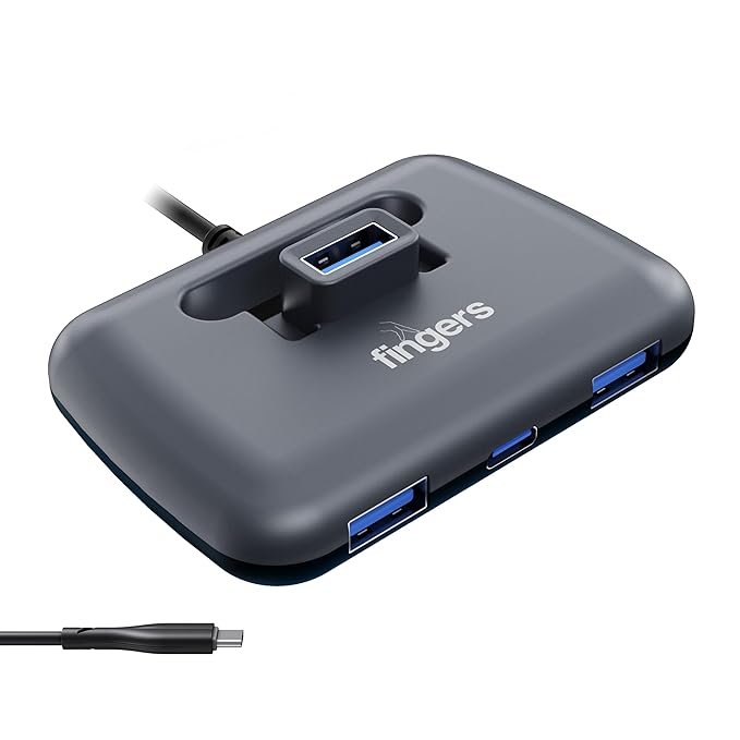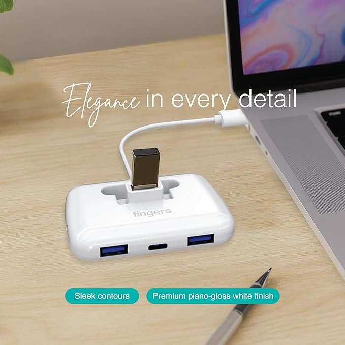 FINGERS Fast-CU3.0 4-Port USB Hub (3 x USB 3.0 + 1 x USB Type-C Ports, Superspeed 5 Gbps, Slim & Portable, Plug & Play, Universal Compatibility) – Classic White