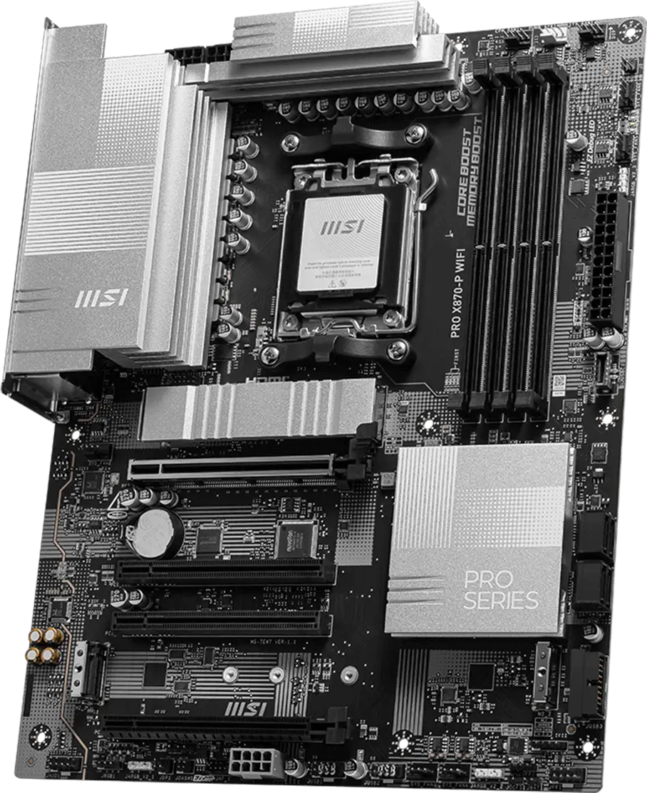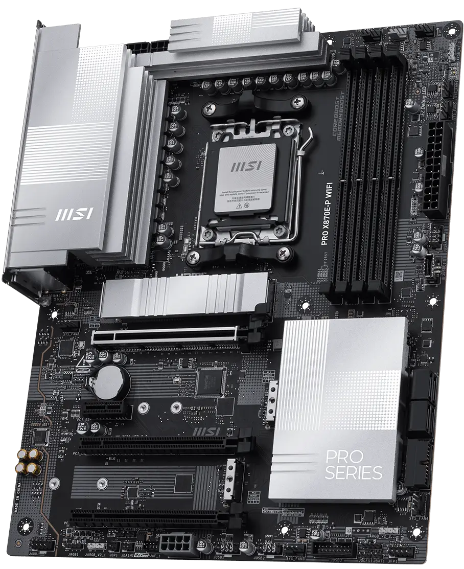 PRO X870E-P WIFI offers a simple design with a harmonious silver color scheme that perfectly matches both white and black PC builds. It is engineered with many exclusive features of MSI, a true Wi-Fi 7 with EZ Antenna, 5G LAN, PCIe 5.0 M.2 with EZ M.2 Shield Frozr II, and Supplemental PCIe Power, ready for the AMD Ryzen™ 9000 series processors.